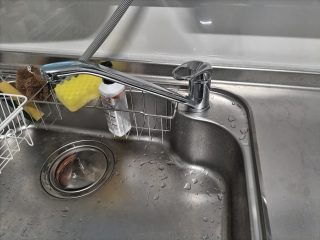 台所蛇口の水漏れがあるのでそちらを見てほしいとの事で見ていくと、台所ワンホール根本に水をかけると、シンク下にポタポタ水漏れが発生しています。お客様にて分岐水栓を取り付けようとした際に不具合が生じた可能性があります。湯水ホースもねじれていることがわかりました。