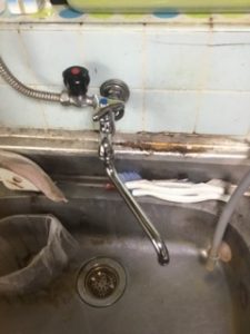 到着してキッチンを拝見すると、シンク床が濡れており、水を流すと床配管から水が逆流する状態です。詳しく見ていくと、25年の油汚れが蓄積し2階キッチンの配管が詰まっています。2階部分なのでお時間は少々かかりますが、今日中に台所をご使用頂けるようにするため、高圧洗浄機で配管お掃除します。